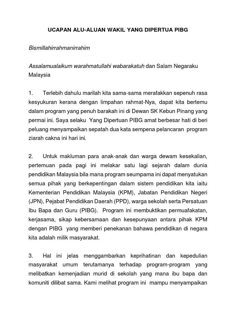 Bismillahirrahmanirrahim Ucapan Alu Aluan Wakil Yang Dipertua Pibg