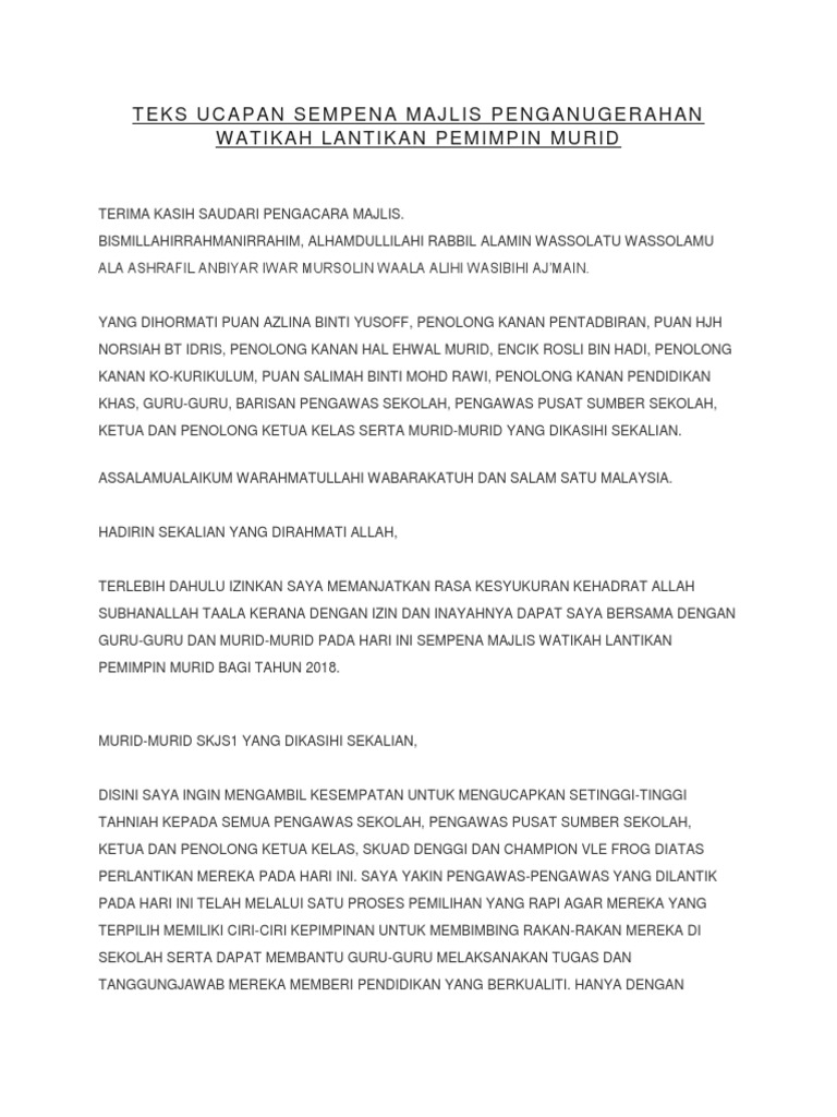Ucapan Wakil Murid Majlis Restu Ilmu Assalamualaikum Wbt Dan Selamat Sejahtera Sejambak Kasih Titipan Sayang Buattuan Text