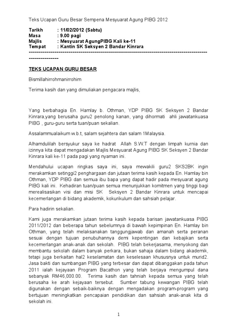 Teks Ucapan Guru Besar Sempena Mesyuarat Agung Pibg 44 Sekolah